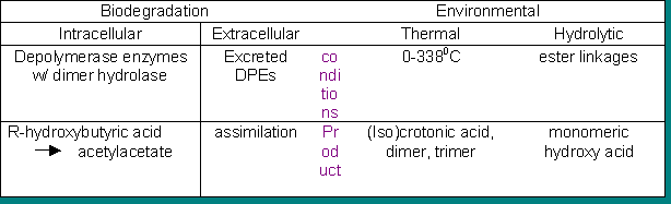 Depolymerase enzymes may be excreted by an organism so that the resulting monomers or dimers may be assimilated into the cell as a nutrient. Thermal degradation results mainly in the dimer ( 20 -38%), some trimer and small amounts of crotonic and iso-crotonic acids. A hydrolytic attack of the ester linkages results in the monomeric hydroxy-acid and is fairly rapid degrading, for example, a bottle is fully degraded within a few months. There are various alternatives to extending the time frame of degradation for example PHBV blend with 75% Cellulose, acetate and butyrate will last longer decaying at a slower rate, however there is considerable weight loss after three months17.