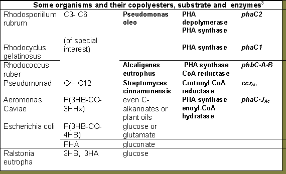In fact the range of products as well as substrates grows exponentially as scientists research the metabolic pathways and the variety of combinations of transgenic strains and modifications to nutrient media. For example, Song and Yoon15 report production of a co polyester of (72-85%) 3-hydroxy 5-phenoxyvalerate and (15-28%) 3-hydroxy 7-phenoxyheptanoate, by P. putida grown on 11-phenoxyundecanoic acid. Our discussion will be limited to the production of P(3HB) and its co polymers with 3 valerate or 3 hexanoate.