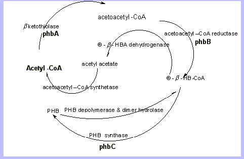 The schematic indicates the basic enzyme system employed in the synthesis as well as degradation within the cell of various micro organisms and some plants. We may differentiate among organisms and plants but the basic scheme is represented above, R. eutrophus, formerly A. eutrophus is of interest as yields of up to 90% biomass of PHB and PHBV4.