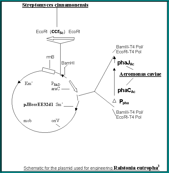 The plasmid is constructed by ligating sequences from previously constructed plasmids, the crotonyl coA reductase from Streptomyces cinnamonensis is amplified and inserted above araC. The other enzymes the two beta ketothiolases and acetoacetyl coA reductase are native to R. eutrophus. The promoter regions are important as transcription is triggered by chemicals in the cell environment. The opposite direction of the sequence may have a delayed response for its expression. Kanamycin is added at 200mg/L for maintenance of the broad-host-range plasmids. The cells are grown in 500 ml flasks shaked at 130 strokes /min for 72 hours at 300 C. ).0.5 % w/w fructose is the medium and arabinose is added after 12 hours to induce gene expression.