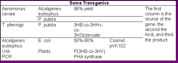 So far, however, nothing compares with A. eutrophus, alias R. eutrophus, which is able to accumulate up to 90% of dry cell weight in PHAs. The life cycle is short for these microorganisms increasing the yield even more. The genes used in synthesis of P(3HB)-co-P(HHx), a copolyester with greater flexibility than the homopolymer P(3HB) and a lower melting point, are shown on the following page3. In constructing the plasmid genes from Aeromonas caviae, producer of the co polymer from alkanoates or plant oils, for the synthases phaJ and phaC are used which have been shown the authors to produce the above co polymer in E. coli from alkanoates, but with R. eutrophus the substrate is fructose.